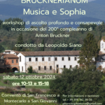 On the occasion of the 200th anniversary of Anton Bruckner’s birth, theatrum phonosophicum proposes a day dedicated to the Austrian Maestro, a deeply religious spirit who dedicated almost every one of his scores ‘ad majorem Dei gloriam’. The workshop will take place at the Convent of San Francesco in Montecarlo (San Giovanni Valdarno), immersed in nature, in an atmosphere of recollection and contemplation. Guided and commented listening sessions of Bruckner’s Ninth Symphony between islands of silence and short readings from the mystical literature of the West are planned morning and afternoon.
