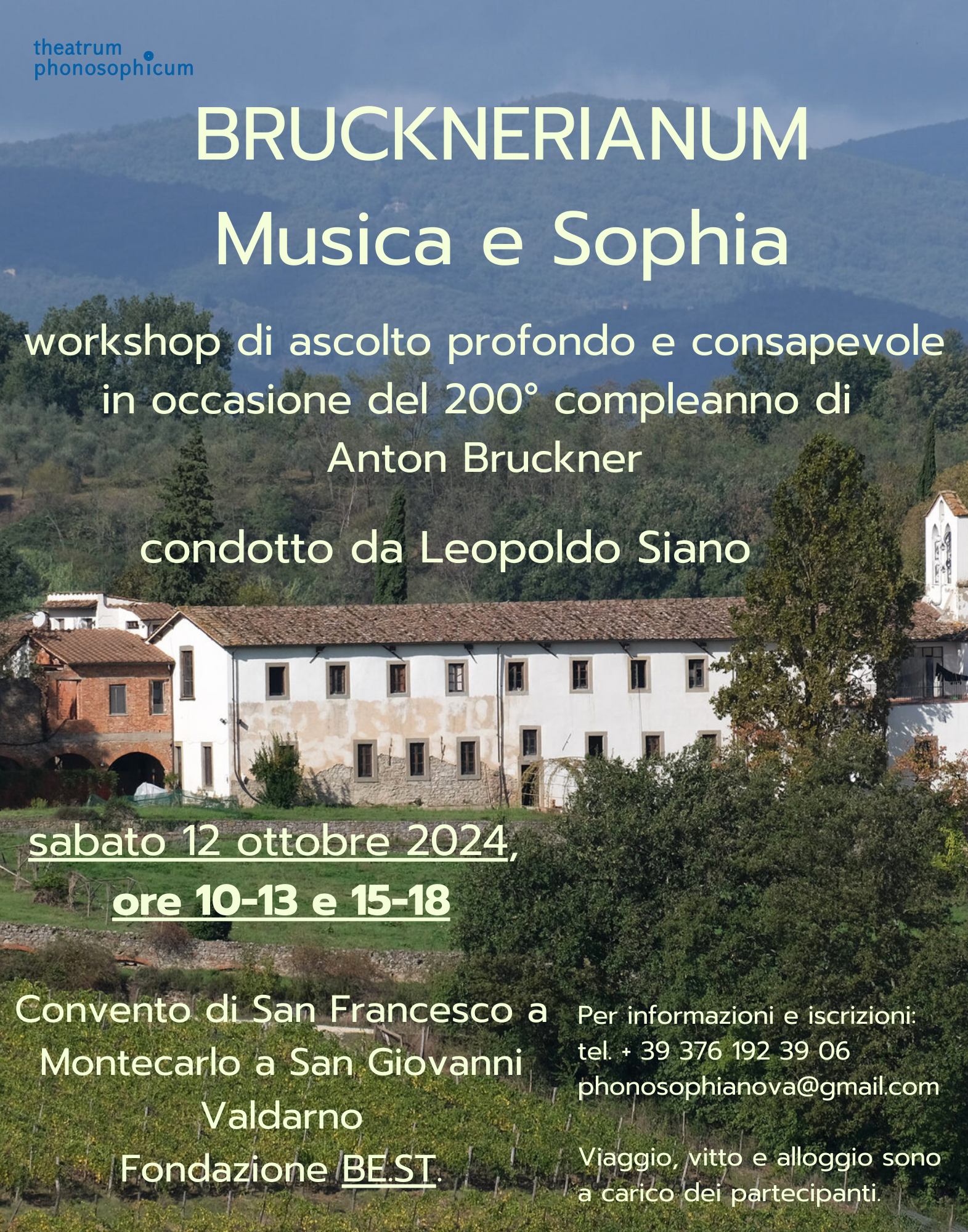 On the occasion of the 200th anniversary of Anton Bruckner’s birth, theatrum phonosophicum proposes a day dedicated to the Austrian Maestro, a deeply religious spirit who dedicated almost every one of his scores ‘ad majorem Dei gloriam’. The workshop will take place at the Convent of San Francesco in Montecarlo (San Giovanni Valdarno), immersed in nature, in an atmosphere of recollection and contemplation. Guided and commented listening sessions of Bruckner’s Ninth Symphony between islands of silence and short readings from the mystical literature of the West are planned morning and afternoon.