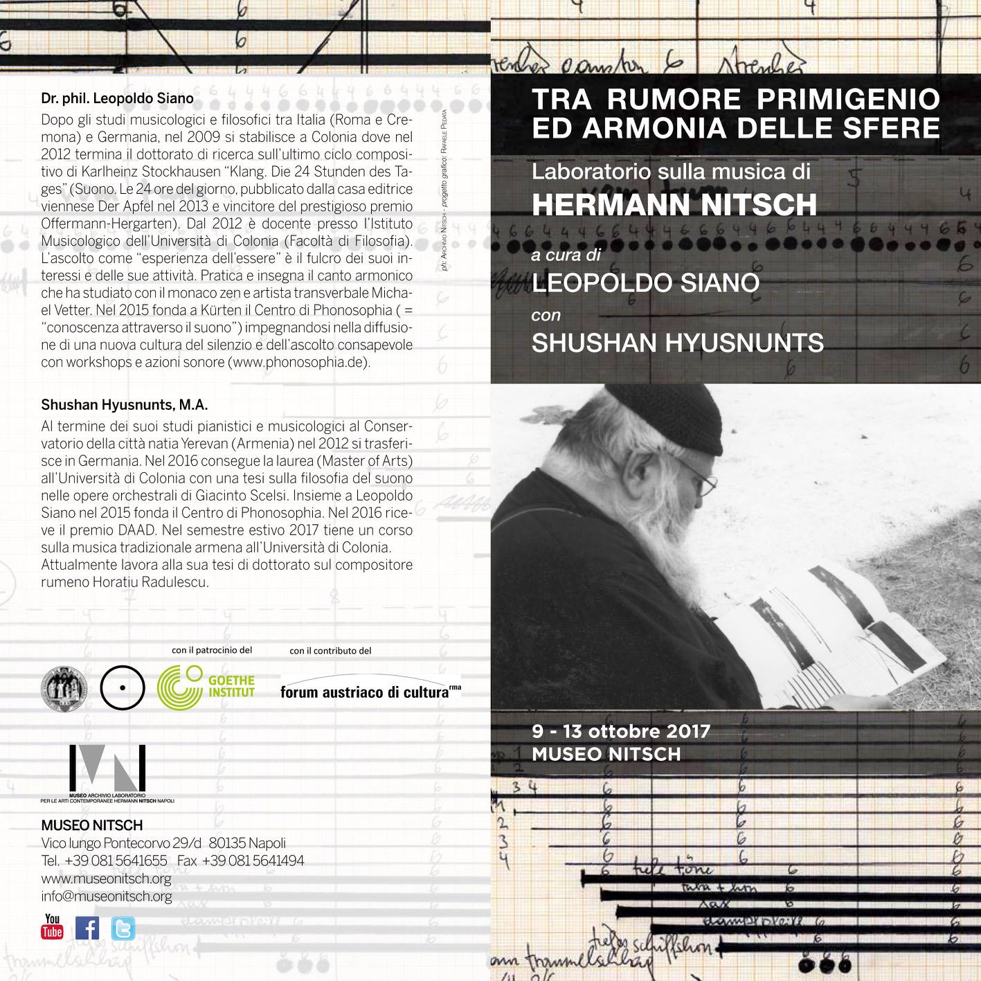 A full immersion in the philosophical-musical world of Hermann Nitsch. The seminar includes a theoretical part with the discussion of Nitsch’s writings and sound examples, as well a practical part aimed at the collective creation of a “sound performance” (Klangaktion) in homage to the Maestro, as the conclusion of the event.
